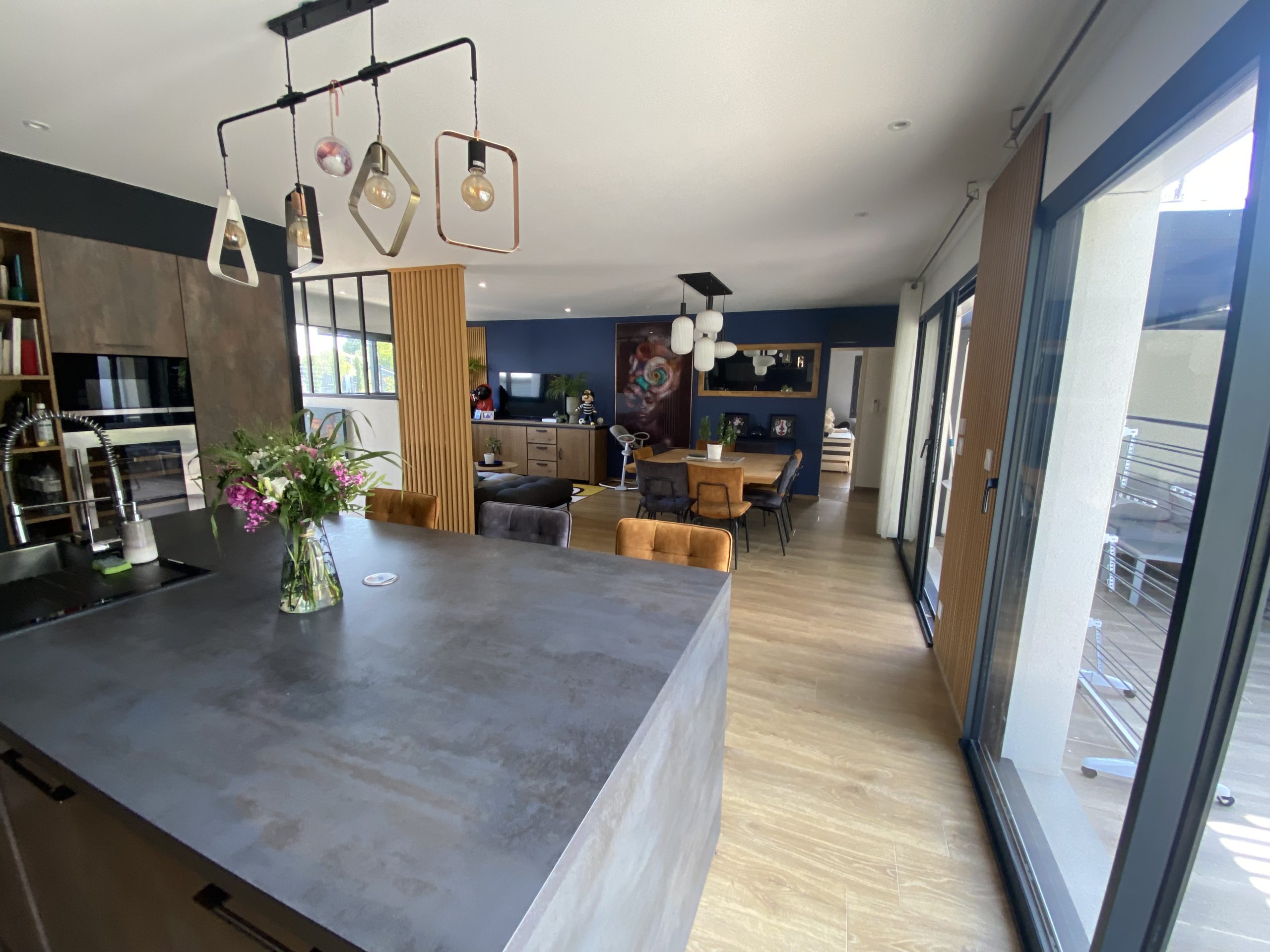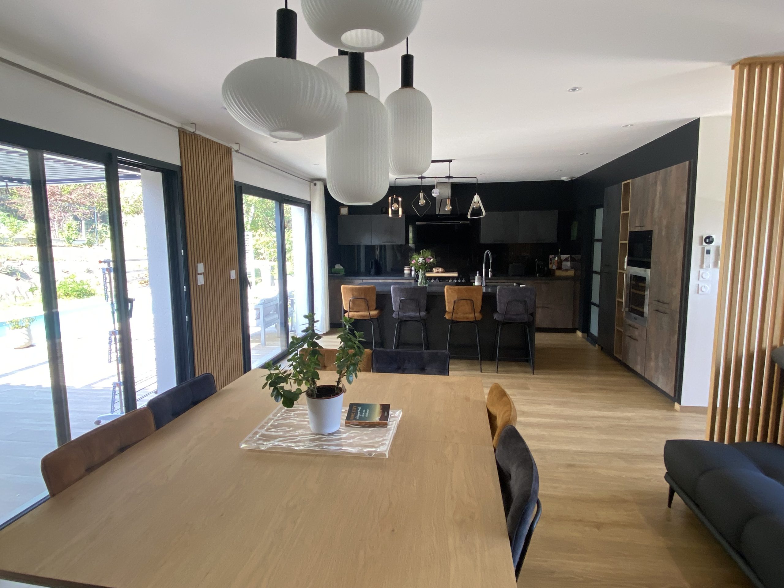 Le bien propose une entrée, qui dessert une vaste pièce de vie de 46 m² avec une cuisine ouverte entièrement équipée et aménagée le tout ouvrant sur une terrasse et sur la piscine.